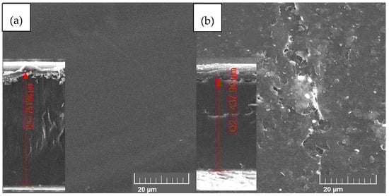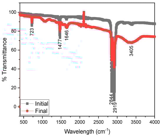 The initial and final FTIR transmittance spectra are shown in Figure 6, where characteristic plastic peaks are observed. The peak at 3405 cm−1 shows the stretching of the OH group, the vibration bands between 2844 and 2919 cm−1 belong to the C-H compounds of the aliphatic group, while the peak at 1646 cm−1 is characteristic of the stretching of the C=O group, and the bands of the peak at 1477 cm−1 show the existence of the COO- groups and the peak at the wavelength 723 cm−1 belongs to the stretching of the C=C group [50,51]. It has been observed that the initial peaks of the spectra decreased in intensity. Previous studies have shown that the fungus Aspergillus can reduce plastic waste by covering the plastic with degradative enzymes and using polyethylene for growth. This demonstrates the fungus’s ability to break down plastic [52]. The fungus Aspergillus is capable of producing hydrolytic and oxidative enzymes and adheres well to plastic substrates [53]. The initial and final micrographs are shown in Figure 7, where a smooth surface without imperfections is shown with an initial thickness of the sample of 751.46 µm. The latest micrograph reveals a surface with irregular porous structures, indicating the strong activity of the fungus Aspergillus. The final thickness is only 437.90 µm, which shows a significant reduction of 313.56 µm. This is a groundbreaking discovery, as it suggests that these irregular structures are formed directly as a result of the activity of the fungal hyphae. These hyphae create a biofilm on the plastic surface, causing streaks and penetrations in the plastic waste. This discovery brings to light the potential damage caused by the fungus Aspergillus and its role in degrading plastic waste [26,54,55].
