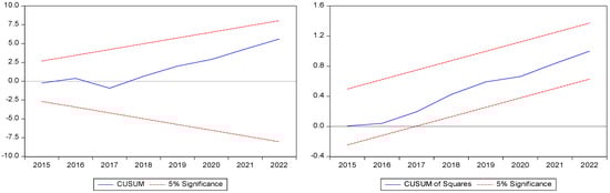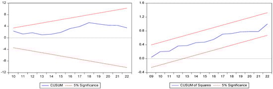 When assessing the stability of a model in the short run, two key tests stand out: the Cumulative Sum (CUSUM) test and the Cumulative Sum of Squares (CUSUMSQ) test. These tools are crucial for understanding how well our model holds up over time. The CUSUM test focuses on tracking the stability of regression coefficients, checking whether they remain consistent throughout the analysis period. In contrast, the CUSUMSQ test takes a broader view, evaluating whether the variability of these coefficients stays steady as time progresses. Together, these tests help to ensure that our model’s results are reliable and robust, as demonstrated by Brown et al. [46].