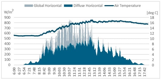 The south-facing bifacial PV module was installed at the QASSIM university campus in Buraydah City, Saudi Arabia (26.34 N, 43.76 E), and its specifications are stated in Table 1. Figure 1 shows the global and diffuse irradiance on the horizontal surface in addition to the ambient temperature which were recorded on the day of the experiment by a nearby meteorological station. The experiment was conducted on a cloudy day (when more than 50% of the sky is obscured by clouds), with multiple readings recorded during two periods along the day—Period 1 (11 a.m. to 12:30 p.m.) and Period 2 (3 p.m.–4:30 p.m.). The readings were ambient temperature, solar radiance, and the temperature of the PV module, along with the operational quantities, which included Isc, Vm, FF, Im, Pm, Voc, and the I–V curves.