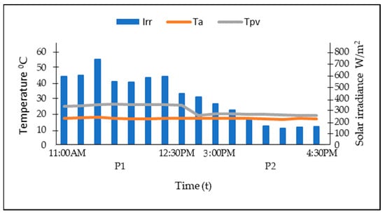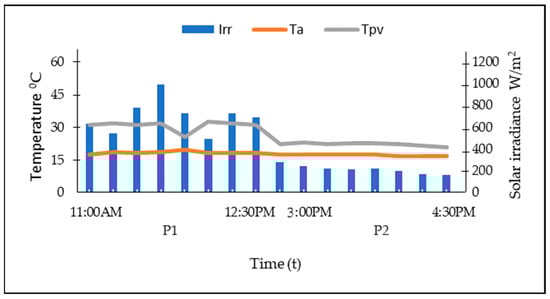 Figure 3 and Figure 4 showed differences in the module temperature (Tpv), ambient temperature, and solar irradiance for both the modules, respectively. The PV cell temperature Tpv is high because the module receives an extra amount of solar irradiance from the back of the module, causing its interior temperature to increase; as mentioned by Meneses Rodriguez et al. [27], the efficiency of the photovoltaic solar cells decreases with an increase in temperature, and cooling is necessary at high illumination conditions.