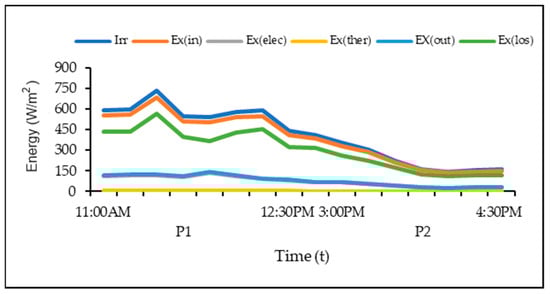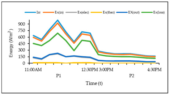 The exergy analysis for the bifacial and monofacial PV modules are illustrated in Figure 5 and Figure 6. It includes the solar irradiance incident, input exergy, electrical exergy, thermal energy, output exergy, and lost exergy which were obtained from the recorded readings using equations from (1) to (17). Input exergy depends on the solar radiation incidence on the PV module in the given study location. During Period 1, the input exergy of the bifacial PV module was 923 W, with a solar irradiance of 989.3 W/m2, while in Period 2, the input exergy was 260 W with a solar irradiance of 279.7 W/m2. The input exergy for monofacial was 734.6 W, with a solar irradiance of 685 W/m2 in Period 1, while the input exergy was 412.5 W with a solar irradiance of 685 W/m2 in Period 2. As per Equation (4), the exergy output is calculated by subtracting the exergy electrical to the exergy thermal. Figure 5 and Figure 6 show the exergy output of both the PV modules. The daily available exergy outputs of the bifacial and monofacial PV modules were 230 W and 122 W, respectively, in Period 1, while in Period 2, the output efficiency for the bifacial and monofacial modules were 62 W and 68 W, respectively. In comparison, the exergy output of the monofacial module was higher than the bifacial PV module due to low thermal exergy.