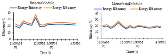 The variations in the energy and exergy efficiencies are exhibited in Figure 7 for the bifacial and monofacial modules. Figure 7 demonstrates the efficiency variation between the bifacial module over the monofacial module during both periods. The bifacial module achieved a 9.5% exergy efficiency with a 7% increase in energy efficiency during Period 1, while in Period 2, the bifacial module displayed a 5.5% improvement in exergy efficiency and a 3.5% improvement in energy efficiency. In the monofacial module, the exergy efficiency was 6.5% with a 5% increase in energy efficiency in Period 1, while in Period 2, the exergy efficiency had a 3.5% improvement in exergy efficiency and a 2.5% improvement in energy efficiency. It is noteworthy that the moments with increased exergy efficiency corresponded to periods of higher module temperature, as illustrated by comparing Figure 2 and Figure 3. Further, the bifacial module showed high exergy and energy efficiency because it received an extra amount of solar irradiance from its rear side, causing its interior temperature to increase, which consequently made the system more sustainable as compared to the monofacial module.