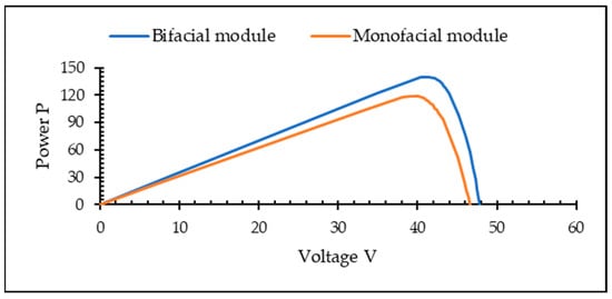 The variations in the I–V and P–V curves of the bifacial and monofacial modules were assessed over two different periods using the PV200 instrument. During Period 1, the bifacial module had a short-circuit current (Isc) of 7.8 A and 48 V was its open circuit voltage (Voc), whereas the monofacial module had an Isc of 6 A and Voc of 47 V (Figure 8). During Period 2, a drop to 3 A with a Voc of 47 V was observed in the bifacial model, while a drop to 1.5 A with a Voc of 45 V was observed in the monofacial module (Figure 9). Concerning the P–V curves, during Period 1, the maximum power output of 140 W/m2 was achieved by the bifacial module, while the monofacial module achieved 120 W/m2 (Figure 10). During Period 2, there was a drop to 54 W/m2 and 28 W/m2 in the bifacial and monofacial modules, respectively (Figure 11). On account of the differences in solar irradiance, multiple I–V and P–V curves were obtained.