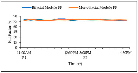 The variation in the Fill Factor during the cloudy day is shown in Figure 12, representing both modules. A high FF value of 80% for both modules was achieved, revealing the optimal efficiency of the modules during the energy conversion process on a cloudy day.
