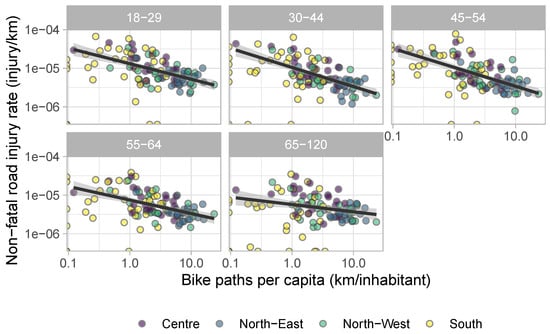 Relationship between non-fatal road injuries and bike path extension in some Italian cities by age group (log scale).