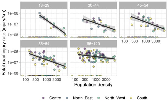 Figure 2 illustrates the relationship between population density and fatal road injuries involving pedestrians. Population density is often found positively correlated with road safety [61]; this is likely due to lower vehicle speed in urban areas and greater use of public transport. This does not mean that cities are a “safe” place for pedestrians since, in absolute terms, the majority of casualties occur in urban environments. Cities are also places where active mobility could be more easily implemented since most trips are short enough to be walked or cycled [61]. Data from Italian cities confirm this hypothesis, at least for fatal injuries. When it comes to non-fatal injuries, the relationship is no longer straightforward. This is probably because impacts—in urban areas—occur at a lower speed than in extra-urban environments and—albeit more common—are less often lethal.