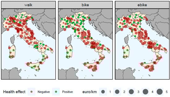 The results show that, taking into account road injury risk, the overall effect is negative for most cities and all three active modes considered. Positive values, in the case of walking, occur mostly in the south of Italy, and, in the case of bikes and e-bikes, in the north, where the cycling infrastructure is better. This is due to the very high road injury rates, which, for most Italian cities, are amongst the highest in the European Union. Increased physical activity improves health mainly through reduced incidence of diabetes mellitus type 2, while most of the damage carried by road injuries is due to traumatic deaths and traumatic brain injury (with permanent damage), highlighting the importance, at least for cyclists, to wear helmets while travelling.