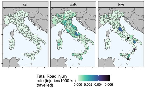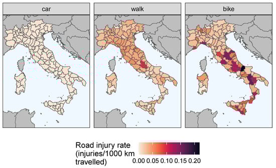 As shown in Figure 5, non-fatal injury rates per km travelled are much higher than car injury rates in every Italian NUTS3 region. In the case of bikes, non-fatal injury rates are particularly high in rural regions where bike or walking infrastructure is scarce and the average vehicle speed is high, making collision consequences worse. In the case of walking, non-fatal injury rates tend to be higher in provinces with a high degree of urbanisation, where collisions are more likely to happen.