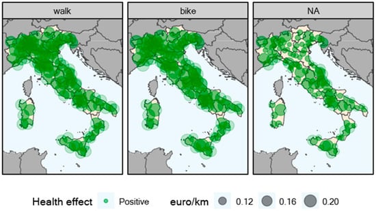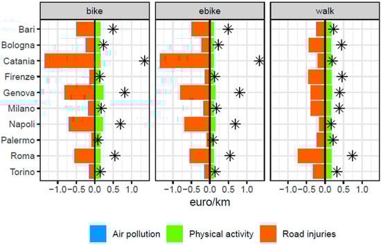 When road injuries are not taken into account—see Figure 8—the overall impact of active mobility on health is positive in all Italian cities considered, underlining the great role road injury risk has in affecting the results.