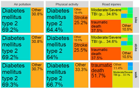 The outcomes that affect health the most are the same across all three active modes considered. The positive effect of physical activity on health is mainly due to the reduction in the number of people contracting or dying from diabetes mellitus (type 2). Diabetes mellitus (type 2) is also the health outcome responsible for most of the damage caused by increased air pollutant intake. The picture changes when it comes to road injuries, however. The outcomes that make the most of the overall health damage caused by increased road injury risk are traumatic deaths and moderate/severe TBI with permanent damage. The former is especially important in the case of pedestrians.