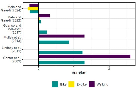 Jarrett et al. [24], Taddei et al. [25] and Kriit et al. [20] carry out the monetary assessment from a taxpayer’s point of view (change in government expenditure in health) and Guariso and Malvestiti [13] from a societal point of view, providing an economic estimate of the impacts of alternative active mobility scenarios in Milan, Italy.