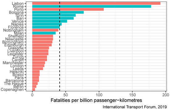Bike road injury rates in selected European cities (Fatalities per billion passenger-kilometres). The dashed line is the sample average, blue bars denote Italian cities [61].