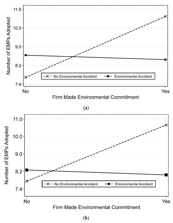 We next evaluate the robustness of an environmental commitment by testing whether an environmental accident (EA) influences (moderates) the relationship between an environmental commitment and EMP adoption (H2). An EA puts pressure on firms to demonstrate their commitment to the natural environment while simultaneously creating obstacles that make it difficult for firms to follow through on a commitment. As before, we separately evaluate EC (RR or ER), RR, and ER. While we only show results in Table 4 for the contemporaneous relationship between an environmental commitment and EMP adoption (for brevity), similar results are observed when testing the lagged relationship. Moderation is signaled by a significant beta coefficient connected with the interaction between an environmental commitment and an EA (Venkatraman 1989). As shown, an EA negatively moderates the relationship between an environmental commitment and EMP adoption, whether the accident occurred in the current (Models 1, 3, and 5) or prior period (Models 2, 4, and 6). Thus, firms that make environmental commitments after experiencing an EA adopt fewer EMPs than they would have adopted had they not experienced an accident. The magnitude of the reduction increases as firms experience more EAs. Since the beta connected to the environmental commitment variable is about twice as large as that connected to the interaction term in all models, the interpretation is that a firm that makes a commitment and experiences one EA increases EMP adoption but adopts fewer EMPs than they would have adopted in the absence of an EA. A firm that experiences two EAs (~50% of firms that experience accidents) has no net gain in EMP adoption. A firm that experiences three or more EAs adopts fewer EMPs than they did in the prior year. The results are supported by interaction plots (for EC, Figure 2a,b). In the plots, an EA is coded as a binary variable, i.e., the firm experienced an EA or not. As shown, an environmental commitment in the absence of an EA (dashed line) results in significantly increased levels of EMP adoption. However, should a firm experience one or more EAs (solid line), an environmental commitment results in reduced levels of EMP adoption, regardless of the period in which the EA occurred. Thus, whether a firm follows through on an environmental commitment by adopting more EMPs depends on whether the firm recently experienced an EA. The combined results support H2.