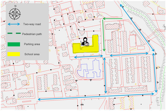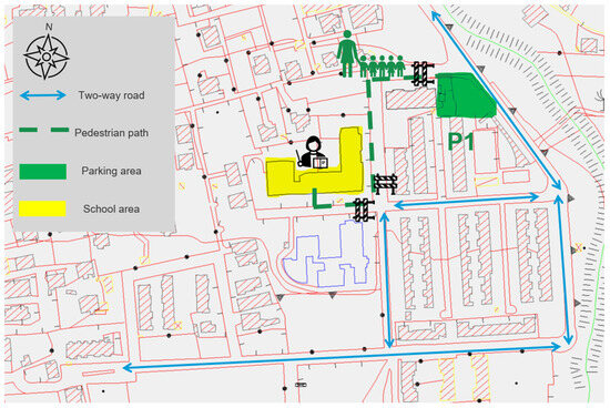 The access from Impastato Street continues to be free, with two-way traffic and parking allowed on both sides. The model area is presented in Figure 2. In the current situation, access to the school is significantly limited due to the circulation of cars, which frequently ignore the traffic ban at the start of the school day (7:00–8:30). The figures show an overview of the location of the school (marked in red); the blue lines are the main roads where the traffic data were collected. In all scenarios software used a 1:2000 scale map for the network development. However, in the paper, the scale of the image was adjusted to fit the width of the text column