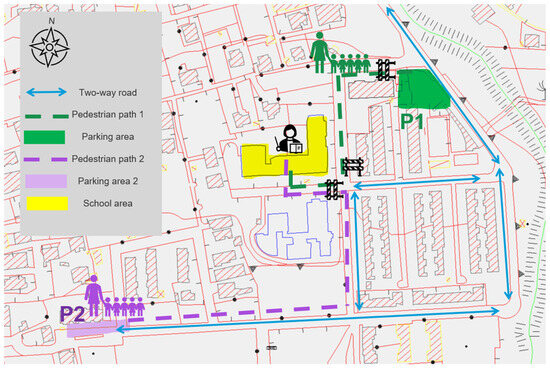 When designing the scenarios, the use of on-street parking for dropping off students was also evaluated. This solution is not presented because it did not offer any significant results in terms of reducing congestion, highlighting the importance of locating parking away from traffic flows to improve parents’ perceptions of safety.