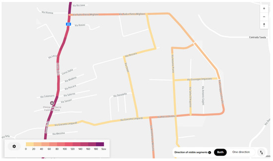 Following the start-up phase, a monitoring phase was carried out to assess the initiative’s impact on mobility in the areas surrounding the school and the WSB terminal. The Traffic Stats tool, which is part of the MOVE portal provided by TomTom, was used for this purpose (Figure 5).