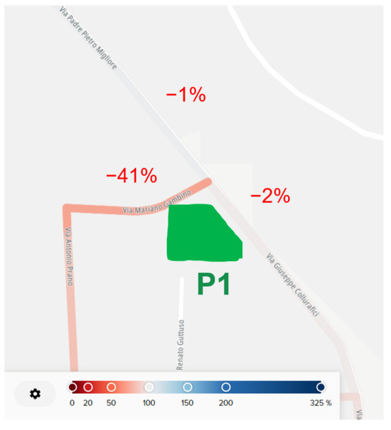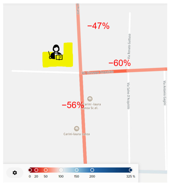 A speed slow-down was observed on the access road to the school (Figure 9), contributing to increased safety for the students. Furthermore, no significant speed variations were observed on the main axis of Padre Piero Migliore Road. These data indicate the absence of traffic congestion and confirm the efficiency of the student–vehicle exchange point in the P1 car park, which is separated from the traffic flow. This contributes to an orderly and safe traffic flow, even at peak times.