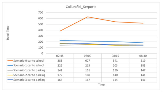 Scenario 0 (in the absence of the WSB scheme) illustrates the considerable travel times associated with accessing the school via the Chinnici–Collurafici route and the roads leading up to the school (Impastato–Prano). Conversely, the introduction of one or more WSB service has been observed to significantly reduce travel times, with these times becoming comparable to the crossing times observed in the study area (i.e., the travel times of individuals who do not have to drop their children off at school).