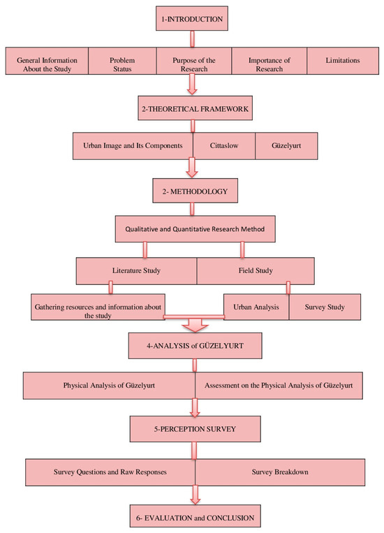 As part of the process, first, we will provide basic information for our study; relevant journal, book, article, and thesis works were reviewed, and literature review was conducted with regard to first urban image and its components, definition of cittaslow concept and associated criteria, history of Morphou and its climatic and geographical characteristics, spatial structure analyses, and survey activity. Afterwards, spatial structure analysis was performed in Morphou, starting with transportation network, streets, and roads; main roads; texture; use of ground floors in buildings; use of upper floors in buildings; conditions of buildings; building construction systems; floor heights; protected and recommended buildings for protection; and green areas. Furthermore, a survey activity was conducted about cittaslow with the purpose of reflecting the views of city inhabitants about the city structure and services. Slovin’s formula was used to determine the number of interviewers for the population of Güzelyurt city, where we conducted the analysis study [23,24]. The questions were chosen based on the physical space and urban service criteria under cittaslow (Figure 1).