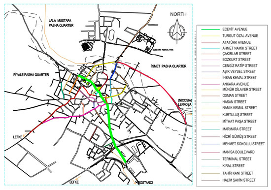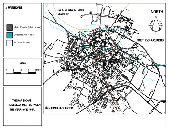 The important connections of the city are provided by the roads from Nicosia in the east and Lefke in the south-west. The road to the north-west is the sea connection at a close distance. The METU Northern Cyprus campus, which is close to the city, can be reached by turning north from Nicosia road. The other roads lead to the agricultural areas. The highway of the city meets the road coming from Nicosia. The peripheral roads are connected to the city centre. The roads in the city are radially distributed in all directions and form the boundaries of the urban parts. The north of the city has become a development area with the existing mass construction and has become a part of the city where multi-storey buildings are located. The assessment of the city centre, where the road network is dense in terms of vehicle and pedestrian relations, is important for the future planning of the city (Figure 2).