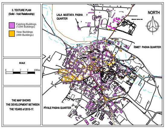 The old and traditional settlement texture of Morphou still forms the centre of the city. The building stock here totals 1793, out of which 499 are new constructions. The texture consists of buildings in contiguous order in the city centre and in separate order outwards. The construction in recent years consists of more multi-storey buildings than in the past. Although there is limited development in the city centre, which has a narrow and shady street structure of a Mediterranean settlement, a new development area has been formed in the northern part of the city. In the south of the city, around Lefke road, a development based on the previous texture continues. The development seen as multi-storey housing and a small industry is in the form of an unplanned texture development because of user needs. In the city centre, where there is a compact settlement, public buildings, shopping areas, and buildings that need to be protected coexist. Pedestrianisation and transportation will facilitate the use of the area (Figure 4).