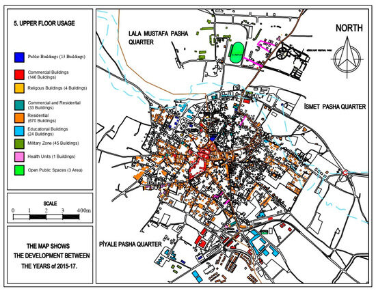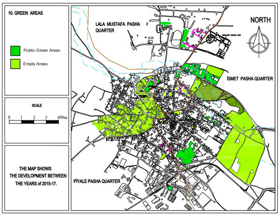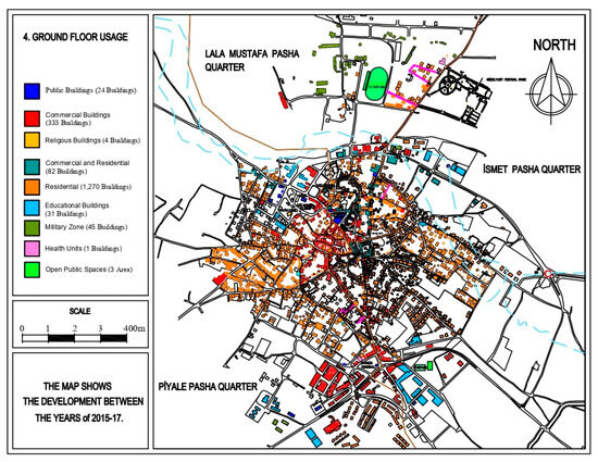 Pursuant to the ground floor use of the buildings, trade is concentrated on Ecevit Street, which is the central street of the city, and on the axes of Ahmet Street, Çakırlar Street, Bozkurt Street, Cengiz Ratip Street, and Aşık Veysel Street. It is observed that residential buildings are located around the commercial areas. At the same time, public buildings, religious buildings, healthcare centres, and educational buildings are scattered between commercial buildings and residences. There is also a military post outside and north of the city. Public parks and green areas and Morphou Festival Park have also been identified as development areas and located in the northern part of the city (Figure 5).