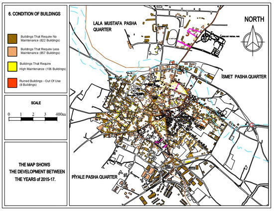 This criterion seems to be quite controversial and subjective, and it varies based on the circumstances. Considering this dimension, a perspective was developed through the observation of the city in general. The buildings that do not require repair are concentrated in the east and west, while the buildings that need some repair are in the north and south. However, the buildings that are in need of significant repair are located on the side streets of the old settlement areas. There are not many out-of-use buildings in the city, which can be explained by the fact that the buildings are highly used, and the income level is good to a certain extent. As a result, the city buildings are generally in good and acceptable condition (Figure 7).