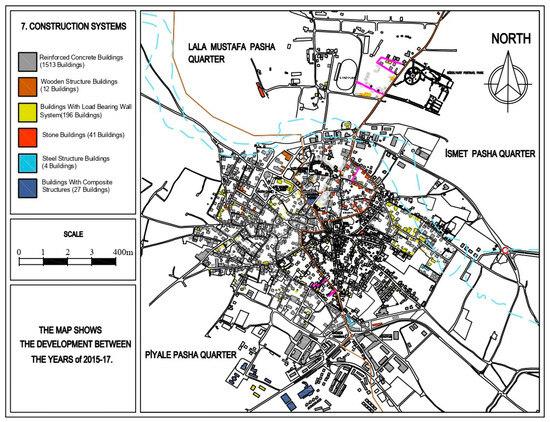 The buildings are generally reinforced concrete. The building system of the M‘unicipality Market’ building on Ecevit Street in the city centre is hybrid. Similarly, on the Ecevit Street axis, the Museum building, and St. Mamas Church, which have become the focal point of the city, there are masonry buildings. The city has masonry, stone, and steel frame buildings in general (Figure 8).