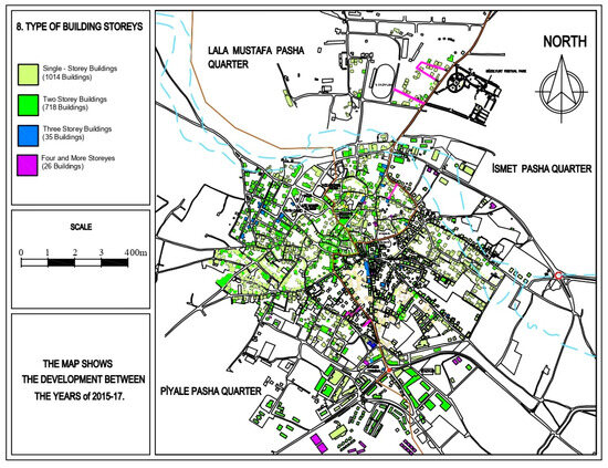 In consideration with our findings, the upper floors of the buildings, mostly in commercial buildings, are located on the axes of Çakırlar Street, Bozkurt Street, Cengiz Ratip Street, İhsan Kemal Street, Aşık Veysel Street, and Ankara Street. The use of upper floors in residential and public buildings is mostly on the parts of these axes that are away from the city centre. Our findings indicated that there are predominantly single-storey buildings in the other areas (Figure 6).