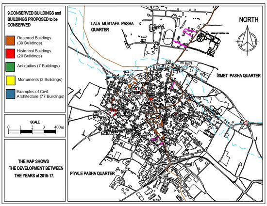 On the axis of M‘ünür Dilaver Street’, one of the busiest streets of the city, there are civil architectural buildings, and on the axis of Ankara Street and Ecevit Street, there are restored buildings and monuments. At the same time, there are historical buildings and restored buildings on the west side of the city, slightly outside the city centre. The most important of these are the Morphou Archaeology and Nature Museum, which is still used as a museum, and the Church of St. Mamas. The buildings that are still used as the Municipality Marketplace and Business Centre are also important buildings with their construction periods (Figure 10).