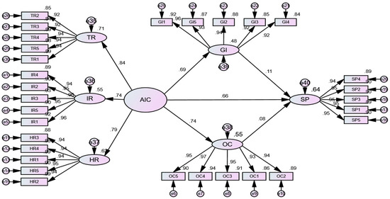 To evaluate the proposed routes, we carried out SEM (Figure 4) based on the fitness of the first- and higher-order measurement models. According to Table 5, the SEM model demonstrates a satisfactory fit to the data (X2/df = 1.352, GFI = 0.877, AGFI = 0.856, CFI = 0.978, TLI = 0.976, IFI = 0.978, NFI = 0.959, RMSEA = 0.052, PClose = 0.275). According to the data, the model was able to explain (e.g., R2 value) 48%, 55% and 64% of the variance in GI, OC and SP, respectively. All three hypotheses (direct effects) are statistically validated at a significance level of p < 0.01. Firstly, Hypothesis 1 posits AIC has a positive and significant impact on in OC that (β = 0.969, p < 0.01); thus, H1 is accepted. Secondly, Hypothesis H2 posits that AIC has a noteworthy and positive impact on GI (β = 0.735, p < 0.01) thus the H2 is accepted. Thirdly, Hypothesis 3 posits integration of AIC has a significant and positive impact on SP (β = 0.815, p < 0.01); thus, the H3 is accepted.