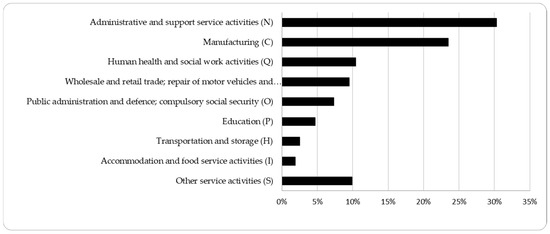 Analyzing the published statistics shown in Figure 1, it can be concluded that 30.3% of people employed were related to the administrative and services activities, which include detective activities (18.7%) and maintaining order in buildings and developing green areas (8.4%). Further groups of employees found employment in the industrial processing sectors (23.5%), and health care and social assistance (10.4%). The remaining sectors accounted for less than 10% of disabled people employed.