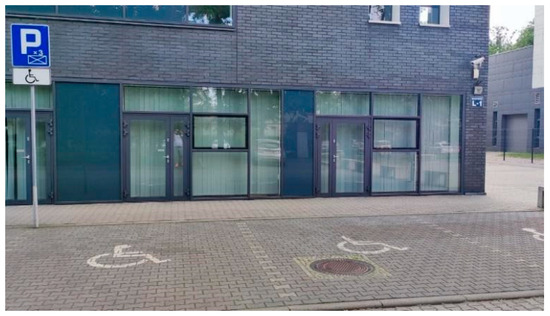 The process of adapting public space to the needs of disabled people may seem complicated and difficult to understand. Is this really the case? The answer to this question will be presented in several examples presenting solutions that have been introduced in buildings used for the didactic education of students with disabilities and university students. One of the basic activities of every person’s day is the process of moving between different locations. Therefore, the space surrounding workplaces and public buildings should be best adapted to this activity. Therefore, the basic activity should be to designate a parking space for disabled people that will meet the appropriate requirements, i.e., adequate space for maneuvering and locating it near the entrance, as shown in Figure 2.