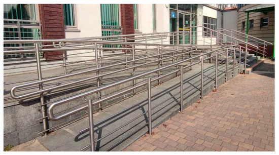 The next step is to reach the building where the workplace is located. Stairs often lead to such buildings, and next to them, there is a dedicated ramp for wheelchair users, as shown in Figure 3.