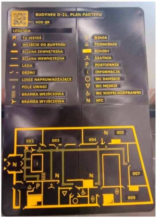 In the case of blind and visually impaired people, it is crucial to enable them to move efficiently around the building. Therefore, the solution presented by the Wrocław University of Science and Technology in the form of a typhlographic map allows them to learn about the building plan in the form of three-dimensional markers that refer to the layout of rooms, which allows them to move around the facility efficiently (Figure 5).