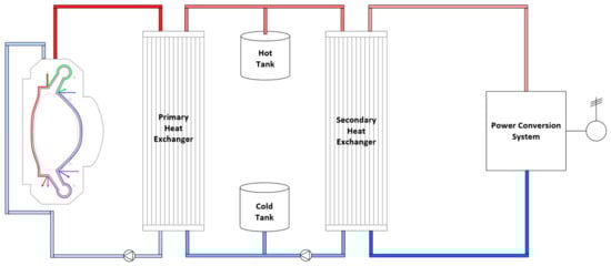 For each configuration analyzed, the input data to be used in GateCycleTM were obtained by performing a preliminary energy balance, referring to pre-existing cycles. The configuration scheme for the three cycles is presented in the following sections. In all the cases, the ARC reactor pulse phase was considered as the reference scenario. Referring to this state, the thermal power produced within the blanket and delivered to the PCS through the intermediate circuit was 645 MWth. The power balance for the total power produced in ARC and delivered to the heat exchangers is reported in [4], and this includes the nuclear heating of the Vacuum Vessel, the nuclear heating of bulk FLiBe, the alpha heating power, and auxiliary power. The total value was also obtained through an energy balance, performed considering data provided in [13]. In addition, in the present work, an intermediate circuit was included in view of the ESS, whose presence was not considered in the analysis discussed in [13]. This system is characterized by a Hot Tank and a Cold Tank, as illustrated in Figure 1. The FLiBe coming from the primary heat exchanger is stored in the Hot Tank. During the pulse phase, a portion of the fluid is directed to the secondary heat exchanger, while the remaining portion is used in the dwell phase to ensure a nearly constant turbine load. The conditions of the intermediate fluid exchanging power with the secondary fluid through the secondary Heat Exchanger (HX) were derived from [14] and are listed in Table 1. They have been postulated according to engineering judgment and experience in order to obtain enough BoP efficiency and to avoid excessive thermal stresses in the primary and secondary heat exchangers (due to the high-temperature differences between the primary and secondary sides of the components). Heat exchangers play a crucial role in the analysis of a plant power cycle, and the study of their performances will be the subject of subsequent work. Concerning the direct configuration for an ARC-like reactor, the study of a double-wall HX is discussed in [15]. This component acts both as thermal coupling between primary and secondary circuits and as a barrier and tritium extraction system. The adopted configuration for the three cycles and the temperature and pressure values were chosen by assessing the options currently available in the literature and selecting the optimal conditions for each cycle. These will be presented in the following sections. The boundary conditions for the secondary heat exchangers in the three cases were determined by striking a compromise between the actual available temperature values and the temperature difference between the inlet and the outlet, which ensured not excessively large exchange surfaces. This allowed the attainment of appropriately sized heat exchangers.