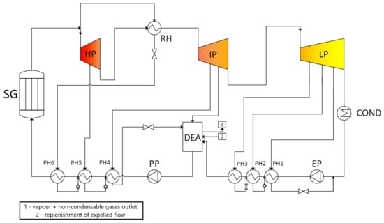 In Table 7, the final values of PCS power and efficiency obtained through the simulation are reported. The values evaluated were overestimated, because they referred only to the PCS without considering the power required by other auxiliary systems. In Table 7, the efficiency values for HP, IP, and LP turbines are evaluated as mean values of the components’ efficiency of each of the three chains.
