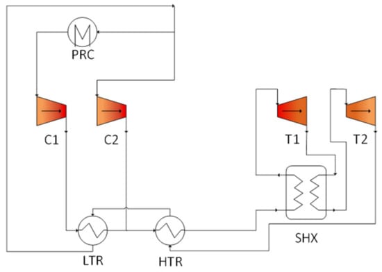 The CO2 Brayton cycle was the second analyzed cycle, reported in Figure 3. This type of cycle is characterized by a simple and compact layout, with high efficiencies at intermediate turbine temperatures (400–600 °C), reducing the capital cost and helping to make nuclear power plants more competitive [18]. Several assumptions are made in its design: the adoption of a precooler for compression near the critical point, where the fluid exhibits a lower specific volume, resulting in reduced compression work; the incorporation of an auxiliary compressor to reduce problems arising from the difference in CO2-specific volumes between high and low pressure; the implementation of regeneration, divided into two phases of low and high temperatures, to avoid the excessive difference in specific heat that would occur between fluid streams flowing to tube and shell sides in case of a single HX; reheating conducted after a first turbine expansion to further increase the efficiency. The CO2 flux, which must be compressed, is divided into two branches, see Figure 3. The former is cooled by a Precooler (PRC) and then sent to the Main Compressor (C1). Instead, the second gas stream is sent to the Auxiliary Compressor (C2). The flow elaborated by the main compressor is then driven to the tube side of a Low-Temperature Regenerator (LTR). Once exited, such flow is mixed with the one coming from C2 and finally drawn to the High-Temperature Regenerator (HTR). In this configuration, the thermal power coming from the intermediate circuit is exchanged through two passages into the secondary HX (shown as SHX in Figure 3). The first passage occurs after the CO2 preheating in the HTR, and it is followed by the gas expansion into the High-Pressure Turbine (T1). The flow is then reheated with a second passage into the SHX and expands in a Low-Pressure Turbine (T2). Finally, the exiting flow is driven to the shell side of the HTR and LTR to provide the needed heat to preheat the flow coming from the compression zone. For what concerns the choice of temperatures and pressures in the preliminary balance, reference has been made to a configuration studied for the DEMO facility [19]. For the evaluation of the required CO2 mass flow rate, the inlet and outlet conditions of the two passages in the SHX have been imposed, and an energy balance has been performed.