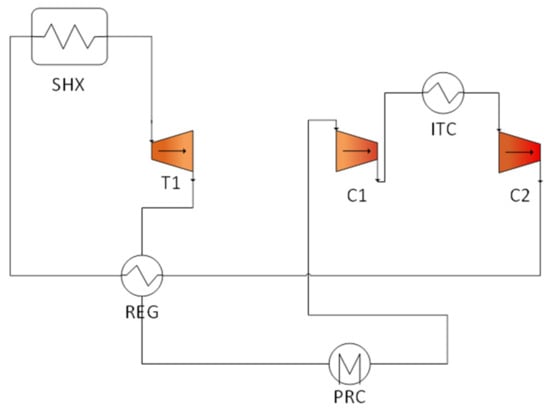 The last analyzed cycle was the supercritical helium Brayton cycle. Studies in the literature are limited, since this technology is not yet very well developed at an industrial scale. The investigated cycle scheme, reported in Figure 4, was inspired by a supercritical He cycle configuration analyzed for the Indonesian reactor RGTT200K, developed by BATAN [20]. The adopted scheme is characterized by an inter-cooling stage and a recuperator, which provides a significant efficiency enhancement but requires a higher system complexity and, consequently, higher costs. The Intercooler (ITC) divides the compression into two consecutive phases and, together with a Precooler (PRC), it reduces the specific volume of the gas, bringing a reduction of the required compression work. The supercritical helium flows through the Secondary HX (shown as SHX in Figure 4), and once heated up, it is sent to the turbine (T1). The fluid is expanded and then sent to a regenerator (REG, shell side), where it preheats the fluid exiting from the compression zone. The fluid is then drawn to the PRC, which cools it, and to a series of two compressors (C1 and C2). They are separated by the ITC, which refrigerates the fluid exiting from C1 and heading to C2. Finally, the fluid coming from C2 is sent to the regenerator and then to the SHX (Figure 4).