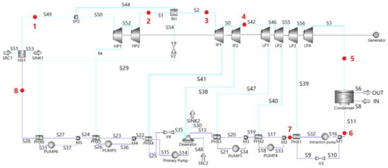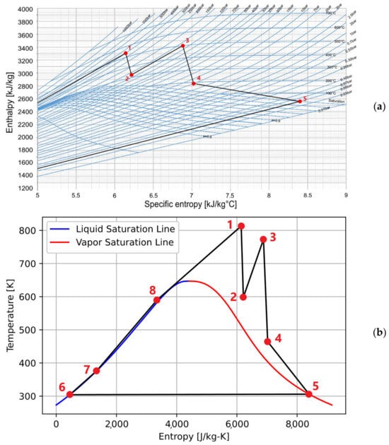 The analysis of the Rankine cycle scheme (presented in Figure 2), as implemented in GateCycleTM, obtaining the model reported in Figure 5, is reported here. In Table 2, the main input values considered in the analysis are shown. The inlet and outlet steam generator temperatures were set referring to [14], while the others were assumed based on engineering judgment and experience. For steam thermodynamic properties, IAPWS-IF97 formulations were used [21]. In addition, some approximations were performed. The secondary HX (shown as HX1 in Figure 5) was simulated with a pure countercurrent flow HX, which exchanged the required power from the intermediate to the secondary circuit. The HP, IP, and LP steam turbines were divided into two, two, and four separate stages, and extractions were placed at the end of each stage. This procedure was used to obtain a faster convergence of the simulation. IP and LP turbines were modeled with the Spencer Cotton Cannon (SCC) method [22], while the HP turbine efficiency was assumed equal to 0.9. The latter occurred because the SCC method is not intended for supercritical applications. The pressures of each extraction were optimized and fixed (see Table 3). In Table 3, each extraction is accompanied by the name of the corresponding stream, as shown in Figure 5. Pumps were modeled by setting the output pressure values of the flow, assuming an input efficiency of 0.85. The cycle calculation, once convergence was achieved, allowed the cycle optimization. In Figure 6, the expansion part of the h-s diagram of the cycle is reported. The remaining part of the cycle was omitted because it was less significant compared to the expansion phase. In Figure 6, the T-s diagram related to the cycle is also included. In both Figure 5 and Figure 6, points indicate the most significant fluid states associated with the proposed cycle, and in Table 4, corresponding values of temperature, pressure, and enthalpy are reported. Table 5 reports the power required by the pumps and the power produced by turbines, while Table 6 summarizes the loads of the different HXs. It is possible to calculate the efficiency of the cycle in the conversion of thermal energy into electricity. According to indications provided in [23], two different powers can be calculated and used as relevant figures of merit to evaluate the cycle performances: the gross power and the net electric power. Their formulas are reported below: