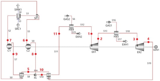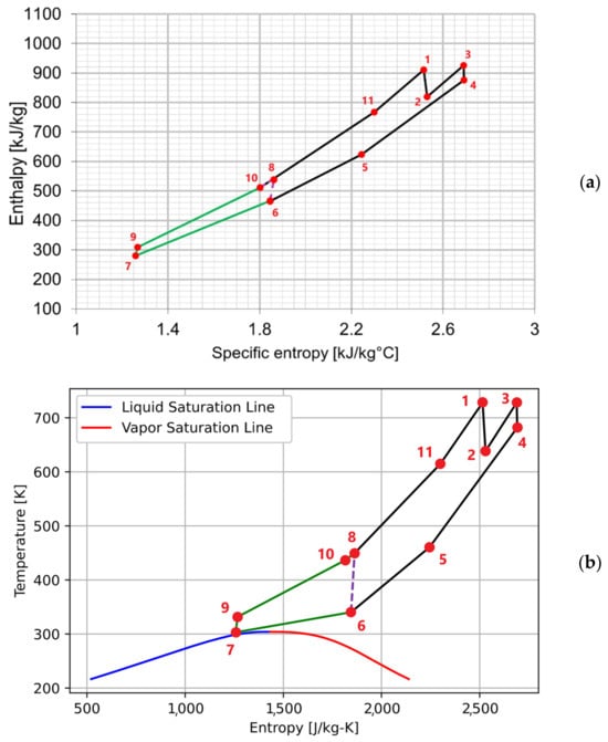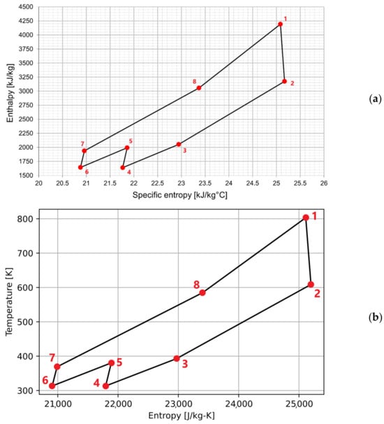 The scheme in Figure 7 represents the implementation in GateCycleTM of the cycle presented in Figure 3. As for the first cycle, Table 8 reports the input values for cycle analysis. In this configuration, the heat exchangers HX4 and HX5 modeled the double passage of the secondary heat exchanger, and the molten salt that should feed their primary sides was simulated with equivalent gas conditions, as already discussed in Section 2.4. As regards the repartition of mass flow between the two compressors, C1 and C2, it was assumed that nearly 80% of CO2 was sent to the main compressor, while the remaining part to the auxiliary one. This distribution influenced the power exchanged by HX4 and HX5 (see Figure 7), and optimized the exchange efficiency, by obtaining a constant temperature difference through the LTR. The exact values were computed by the code to exchange the rated thermal power (645 MWth) coming from the intermediate circuit. The pre-cooler HX1 uses water as a cooling fluid. Compressors C1 and C2 were modeled with an efficiency equal to 0.9, setting the desired outlet pressure. NASA thermodynamic data for supercritical CO2 were considered [24,25,26]. In Figure 8, the h-s and T-s diagrams corresponding to the cycle are reported. The differentiation in two colors is intended to highlight the presence of two parallel compression phases: the main one (points 6–7–9–10 in Figure 8, indicated by the green line) and the auxiliary one (points 6–8–10, represented by the dashed purple line). Flows coming from these two compressors mixed in the mixer M1, allowing the generation of a fluid with the conditions presented in Table 9 with the point 10 (and whose subsequent path is depicted in Figure 8 with the black line). This table presents the thermodynamic conditions (i.e., temperature, pressure, and enthalpy) associated with the most significant fluid states within the proposed cycle, corresponding to the red points in Figure 7 and Figure 8. Results are presented in Table 10 and Table 11. The former contains the power required by compressors and produced by turbines, while the latter provides the loads characterizing the heat exchangers in operating conditions. In this case, the formula of the net electric power reported in Section 2.4 must be modified, obtaining the new expression presented below: