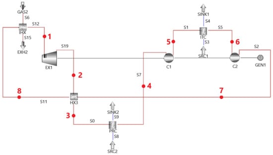 In the following paragraphs, the simulation results obtained with GateCycleTM software [12] are reported. For calculation purposes, the numerical models presented so far and corresponding to the preliminary cycles were used. First-tentative pressure and temperature fields were obtained for the configurations presented in Figure 2, Figure 3 and Figure 4 by performing the energy balance in some selected points of the scheme. The obtained data were used as input values for the simulation. Starting from them, the software performed several iterations until the layout converged to the final pressure, temperature, and mass flow values. To perform the simulations, some initial assumptions were made. GateCycleTM does not include molten salt as an operating fluid. For this reason, in the primary side of the secondary HX, the molten salt was substituted by other fluids under conditions necessary to exchange the required power. This choice can be made because the type of primary fluid does not affect the analysis results. Additional detailed analyses on the HX component have been conducted [15], and further investigations will be carried out in subsequent works. In addition, in these preliminary cycle analyses, pressure drops in pipelines have been neglected. For each component, there is the possibility to select “design mode” or “off-design mode”. With the first option, the components are designed ex novo, and their input parameters are chosen by the user, while in the second one the design of components is imported from a previous case [12]. In the current work, all components were set in “design mode”.