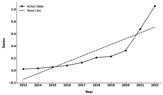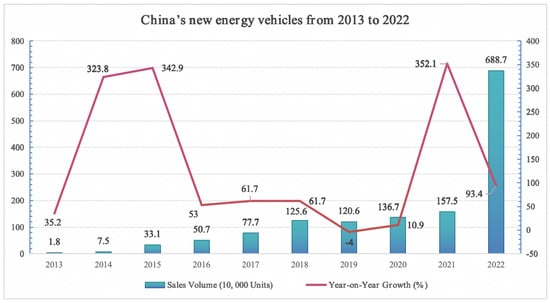 In the face of global energy crisis, environmental degradation, and climate change, the development of new energy vehicles (NEVs) has become a strategic priority for many countries [1,2]. NEVs, including battery electric vehicles (BEVs), plug-in hybrid electric vehicles (PHEVs), and fuel cell electric vehicles (FCEVs), offer a promising solution to reduce greenhouse gas emissions, improve air quality, and enhance energy security. BEVs and PHEVs have been shown to significantly reduce greenhouse gas emissions compared to conventional vehicles [3,4,5]. FCEVs, powered by hydrogen, have the potential to further reduce emissions and improve energy efficiency [6]. Moreover, the adoption of NEVs can lead to improvements in urban air quality [7] and contribute to the overall sustainability of the transportation sector [8]. As the world’s largest automobile market and a major carbon emitter, China has been actively promoting the NEV industry through a range of policy instruments, such as subsidies, tax incentives, and infrastructure support [9,10,11]. As shown in Figure 1 and Figure 2 and Table 1, the sales of new energy vehicles are on an upward trend, so policy research on new energy vehicles is imminent.