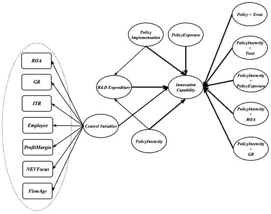 In the Empirical Models Section 3.3, we will specify and estimate the models based on the block diagram of empirical models with hypotheses, as shown in Figure 3. First, we will introduce the dependent variable, Innovation Capability, and the key independent variables: policy variables (Policyt, PolicyIntensityt, PolicyExposurei), treatment group identifier (Treati), R&D investment (RDi), interaction terms (Policy × Treati, PolicyIntensityt × Treati, PolicyIntensityt × PolicyExposurei, PolicyIntensityt × ROAit, PolicyIntensityt × GRit), and control variables (ITRit, log (EmployeeCountit)), ProfitMarginit, FirmAgeit, NEVFocusi, ROAit, GRit).