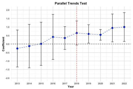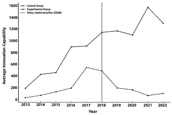 The parallel trend test examines whether the treatment and control groups have similar trends in the outcome variable before the policy implementation. Figure 4 presents the results of the parallel trend test. The graph plots the coefficients and confidence intervals of the interaction terms between the treatment dummy (experimental group) and the year dummies. The coefficients before the policy implementation year (2018) are not statistically significant, as indicated by the confidence intervals crossing the zero line. This suggests that the innovation capability of NEV passenger vehicle manufacturers (experimental group) and traditional passenger vehicle manufacturers (control group) followed similar trends prior to the Dual-Credit Policy, supporting the parallel trend assumption. In addition, Figure 5 shows the time trend of innovation capability (measured by the average innovation capacity) for the experimental group and the control group from 2013 to 2022. The two groups show similar trends before the implementation of the Dual-Credit Policy in 2018. After 2018, the innovation capability of NEV passenger vehicle manufacturers (experimental group) increases at a faster rate compared to traditional passenger vehicle manufacturers (control group), consistent with our main findings.