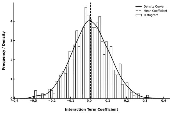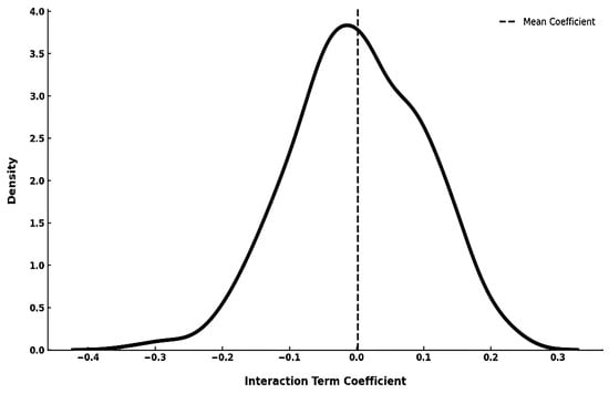 Figure 7 provides a combined visualization of the actual coefficient estimate and the distribution of placebo coefficients. The histogram represents the distribution of placebo coefficients, while the blue line represents the kernel density curve of the placebo distribution. The red dashed line indicates the actual coefficient estimate from the main model.
