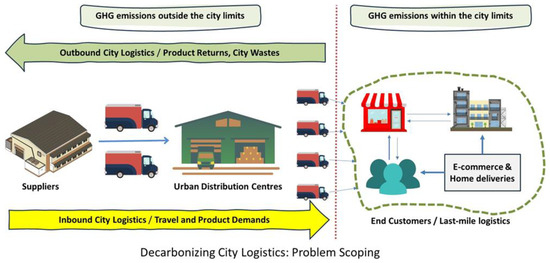 Transportation-related operations produce approximately one-fourth of the CO2 emissions contributing to global warming [8]. Most of these emissions are produced during logistics operations where the primary mode of transportation is conventional vehicles that use fossil fuels [9]. This study emphasizes logistics operations in urban areas, which we will call city logistics. In Figure 1, we present a pictorial description of a typical city logistics process where high levels of GHGs are produced due to the transportation of various goods. Since the population and demand for city logistics continuously increase, these emissions are expected to rise [10,11]. This exacerbates environmental and societal well-being by increasing global warming and air pollution, raising various health concerns [12]. However, logistics operations play significant roles in cities in terms of economic development, and transportation of essential goods and passengers that meet urban life demands (cf. [13]). Therefore, removing these operations cannot be feasible in terms of the sustainability of cities. Yet, greener cities can be achieved by developing solutions that have the potential to mitigate the negative impacts of city logistics.