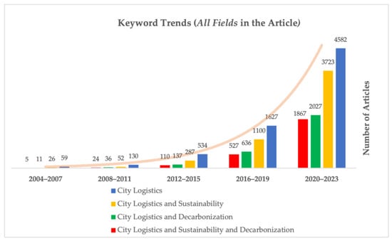 Given the urgent need for DCL to achieve more sustainable cities, we analyzed and reported the current research trends in the DCL literature. Considering our keywords, we analyzed the number of scholarly articles written in English each year between 2004 and 2023 to observe the emphasis on the DCL literature and the portion of articles that took sustainability into account. We obtained data on the number of scholarly articles from SCOPUS. First, we retrieved the number of articles published each year from the search term “city logistics” and its synonyms, represented with blue (see Figure 3 and Figure 4). Second, we also added sustainability to city logistics and recorded the data (represented in yellow). Third, we added decarbonization to “city logistics” and excluded the sustainability term (represented with green). Finally, we combined all key terms (represented in red). Figure 3 illustrates the number of published articles we obtained when the key terms were searched in all fields (title, abstract, keywords, text) of the articles. On the other hand, Figure 4 represents the number of published articles we obtained when the key terms were searched only in articles’ titles, abstracts, or keywords. We aggregated the years so that each of the five periods represents a four-year subperiod.
