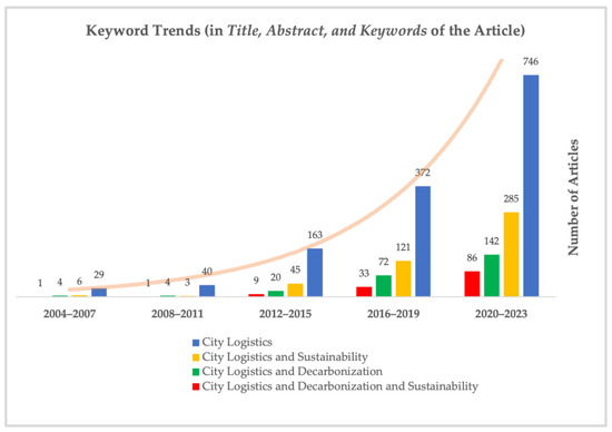 We observe a similar trend in all four search terms in both Figure 3 and Figure 4, demonstrating an increase in the number of scholarly articles published, especially after 2008–2011. Moreover, the number of articles has increased significantly in the final four-year period, 2020–2023. Considering these, we deduce that city logistics, decarbonization, and sustainability terms have recently drawn significant attention from researchers, which is reasonable considering the urgent need for action to minimize the impact of city logistics on CC. Second, we noticed that the concept of decarbonization has received relatively less attention in the context of city logistics. As given in the final period of Figure 4, only 86 articles used the term “decarbonization” in their titles, abstracts, or keywords, whereas there are 746 articles that used “city logistics”. This ratio is even lower in the prior sub-periods. One potential reason for this can be the unfamiliarity of the term since, based on our observations, several studies have proposed solutions to reduce CO2 emissions in city logistics, yet they do not explicitly use the term “decarbonization” in their papers. An overall deduction from Figure 4 is that research focusing on decarbonization and sustainability in the city logistics context is still scarce despite the consistent increase in studies published throughout the last 20 years.