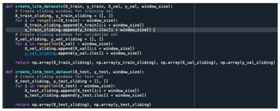 This window included multiple features (excluding the target variable) to capture the contextual information surrounding each data point. Figure 4 shows a code snippet of the siding window algorithm. The corresponding target variable value (in this case, the logarithmically transformed revenue) for the last time step within each window was extracted and used as the label for training the LSTM model: